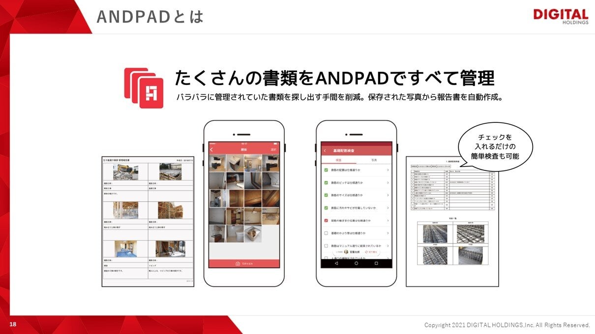 実際に工事が始まると、協力業者様が現場へ行くたびに入退出や写真付きでの報告が毎日のように届きます。協力業者様も内容が見られるため、計画に沿った進捗かどうかが分かるようになっています。それを参考に「来週の工事はどんな進み具合になりそうか」といったことを全員で把握できるようになっています。また、現場のセルフチェックや検査はアプリを利用して、監督が項目をチェックする仕組みも備わっています。