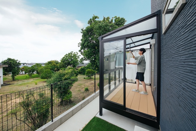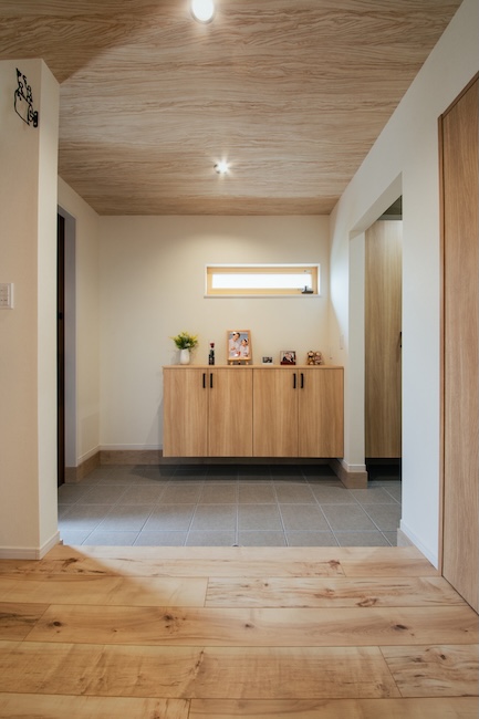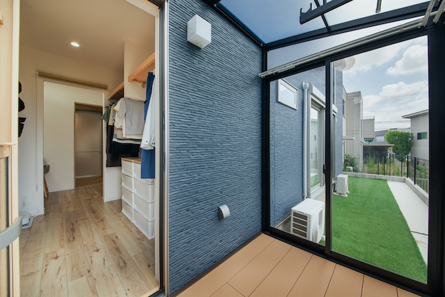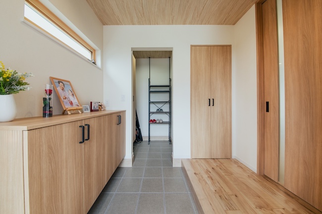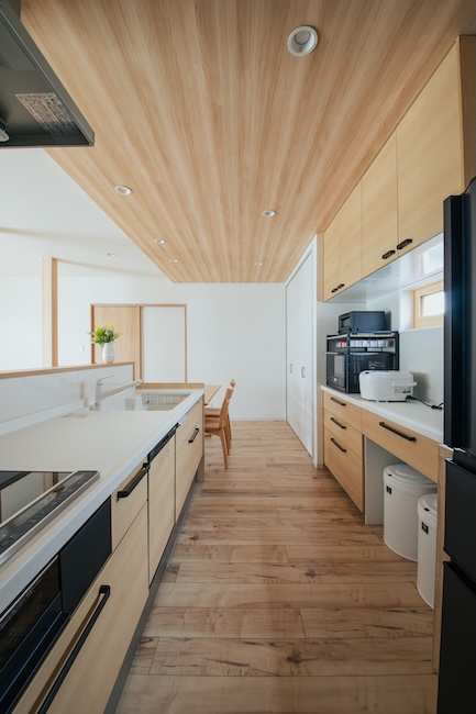 「土地を見て、1階に洗濯物干しスペースは無理かもしれない」というK様の不安を解決したのが南側に設けたサンルーム。そこからは、吉川住建のスタッフがご提案したファミリークローゼット、洗面スペース、そして浴室が直線でつながっています。他には、ご要望だった広い玄関には土間を設け収納スペースもたっぷり!さらに、横幅を6メートルとしたダイニングとキッチンは回遊できるようになっていて、パントリーはリビング収納も兼ねています。2人で料理をする機会が多いK様ご夫婦。アパートのキッチンと比べて、すれ違いやすさから広さを実感していただいています。