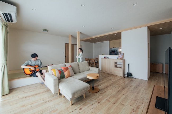「インテリアには木目のあるものを取り入れたくて、ナチュラルな仕上がりを希望しました。キッチンの上の下がり天井もその一部です。ソファの脚の部分やダイニングテーブルなども木で揃えています。住み始めた当初からすぐにリラックスできる感じもしていいですね。賃貸の時に使っていた18帖用のエアコン1台で快適で、断熱性の高さも感じています。」