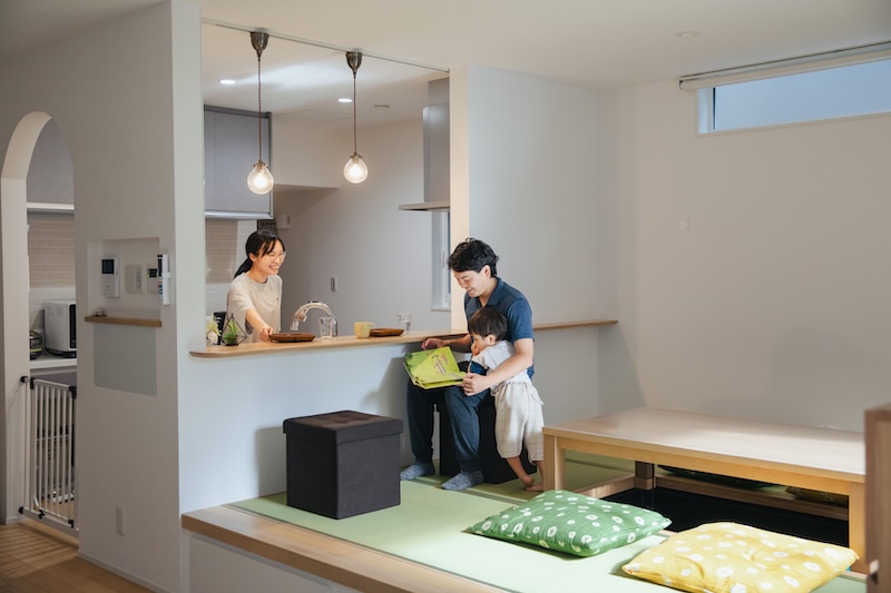 吉川住建の対応について「家づくりが自由にしてもらえるところがよかったです」と気に入ったポイントをお話ししてくださいました。奥様がこだわったキッチンは、Instagramでお気に入りのアカウントを熱心に研究されていました。その結果「自分たちのオリジナル」のキッチンが完成!満足にご利用いただいています。